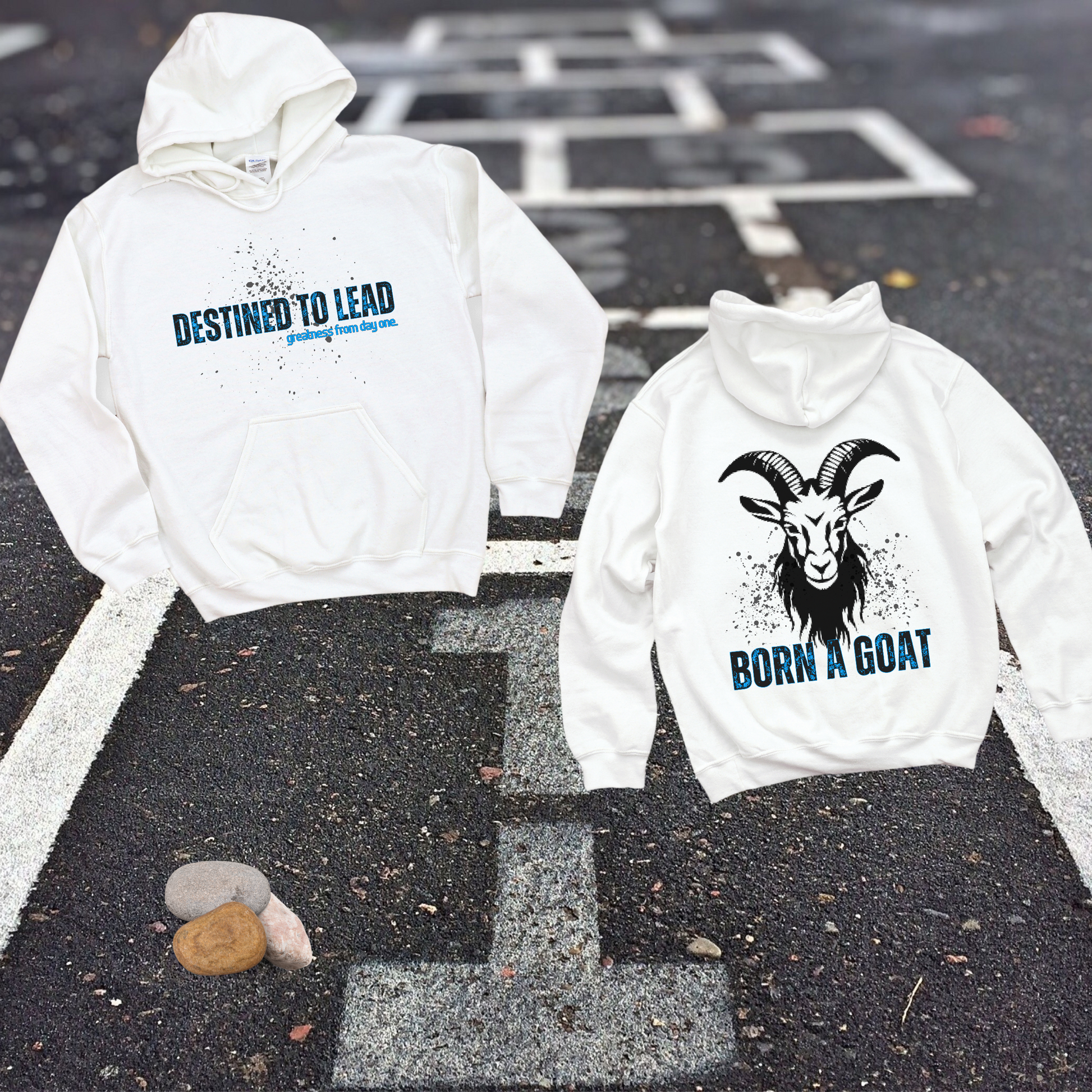 Keep your young achiever cozy and confident with our white “Born a GOAT” hoodie. We’ve swapped the design so the bold “Destined to Lead” phrase appears on the front and the signature goat graphic takes center stage on the back. Perfect for cooler days, this hoodie is made to inspire greatness wherever they go.