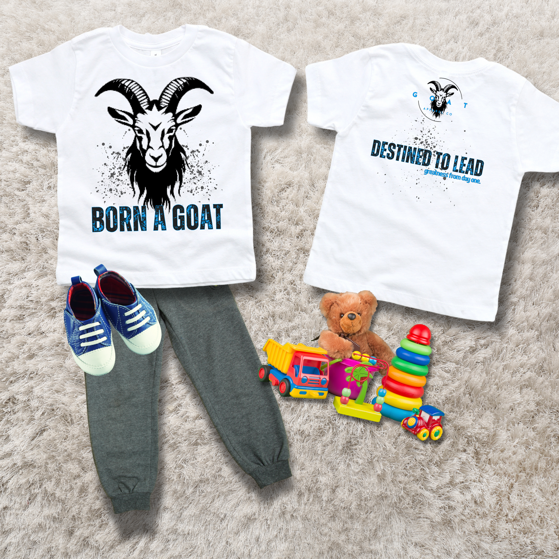 Short Description: Empower your child with our bold “Born a GOAT” tee in white, accented by stylish blue text and graphics. Perfect for everyday adventures or sporting events, this soft and breathable shirt keeps kids comfortable while showcasing their natural leadership spirit.