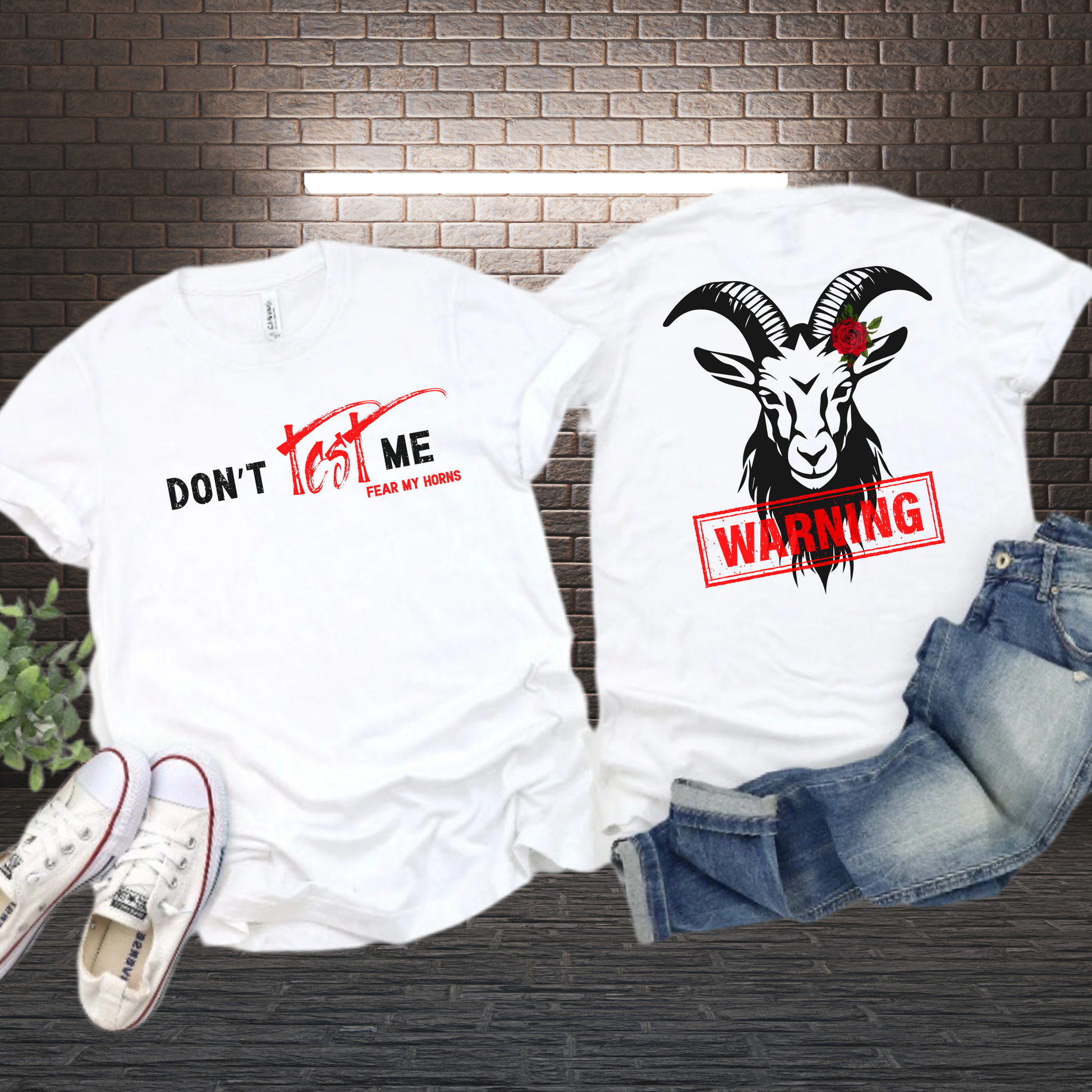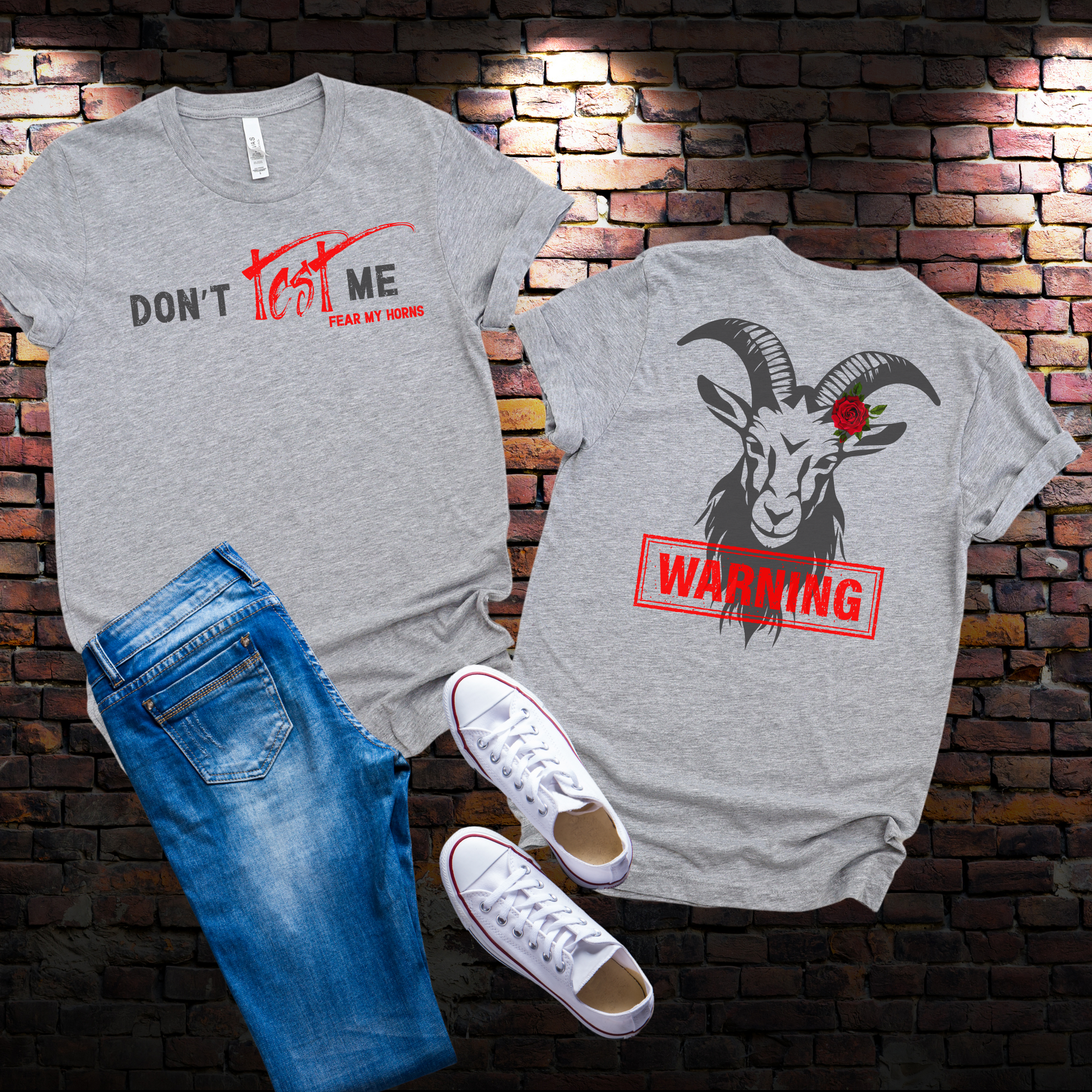 This women's t-shirt design features a bold, edgy message perfect for those who embrace a fierce and confident attitude. The front of the shirt displays the slogan "Don't Test Me" in a powerful combination of black and red, with the words "Fear My Horns" added below for an extra punch. On the back, a detailed illustration of a goat with prominent horns, adorned with a striking red rose, is accompanied by a red "Warning" stamp, adding a mix of attitude and warning vibes.