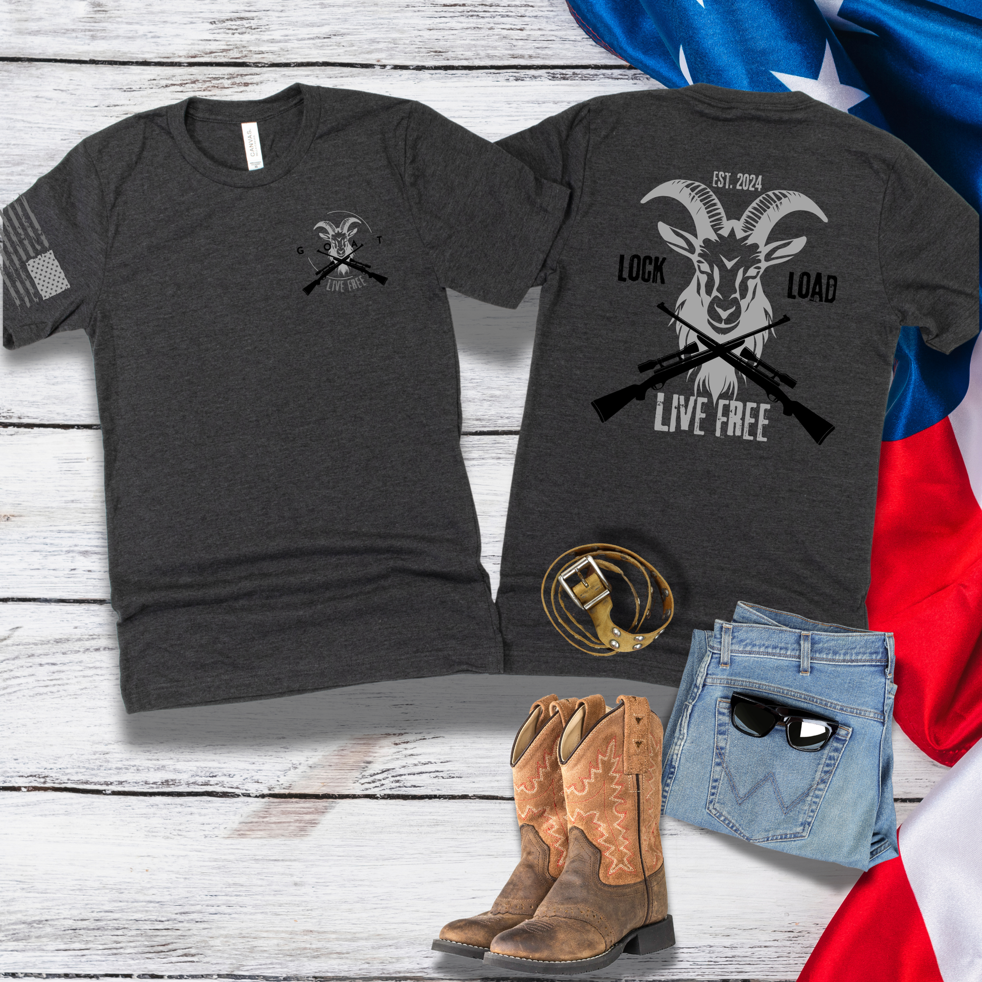 - Back Design: Iconic GOAT Head Logo with crossed shotguns/rifles and the commanding phrase “LOCK LOAD LIVE FREE” in bold, light grey text