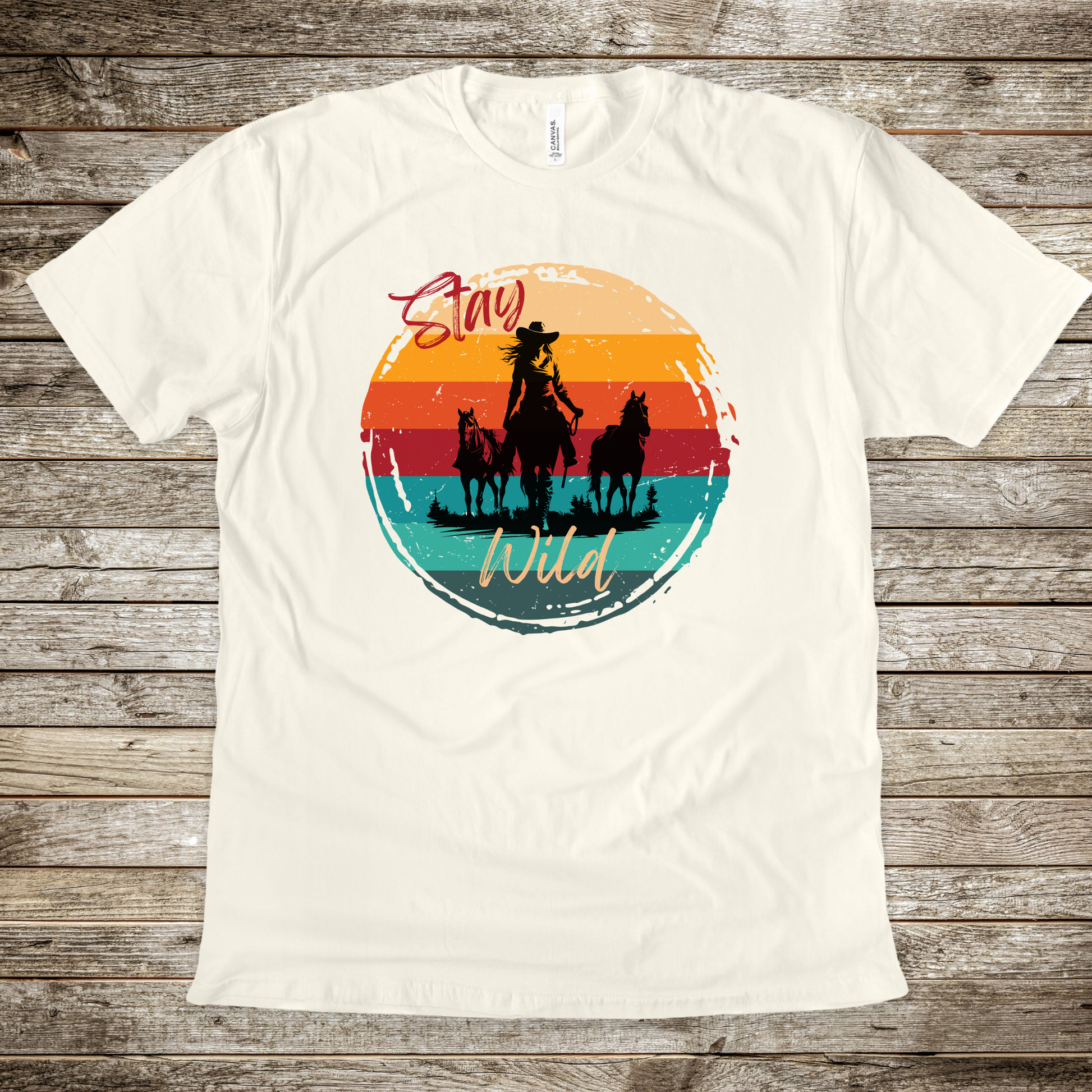 The Stay Wild Sunset T-Shirt captures the beauty of nature and the spirit of freedom with its retro sunset image featuring a cowgirl and her horses. Made with high-quality materials, it is available in multiple colors. Channel your inner wild and free heart with this unique and stylish t-shirt.